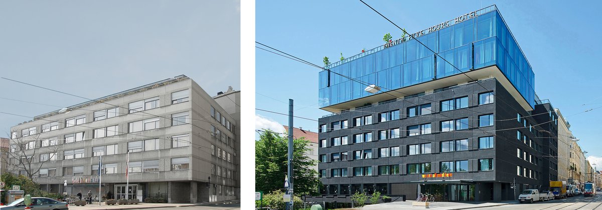 Aufstockung eines Studentenheims und Umbau in ein Hotel in zwei Bauphasen: 2009–2011_Dreigeschoßiger Dachaufbau mit Bar, Terrasse. 2011–2013_Umbau Hotel mit Untergeschoßen, Tiefgarage, Seminarräum und Wellnessbereich