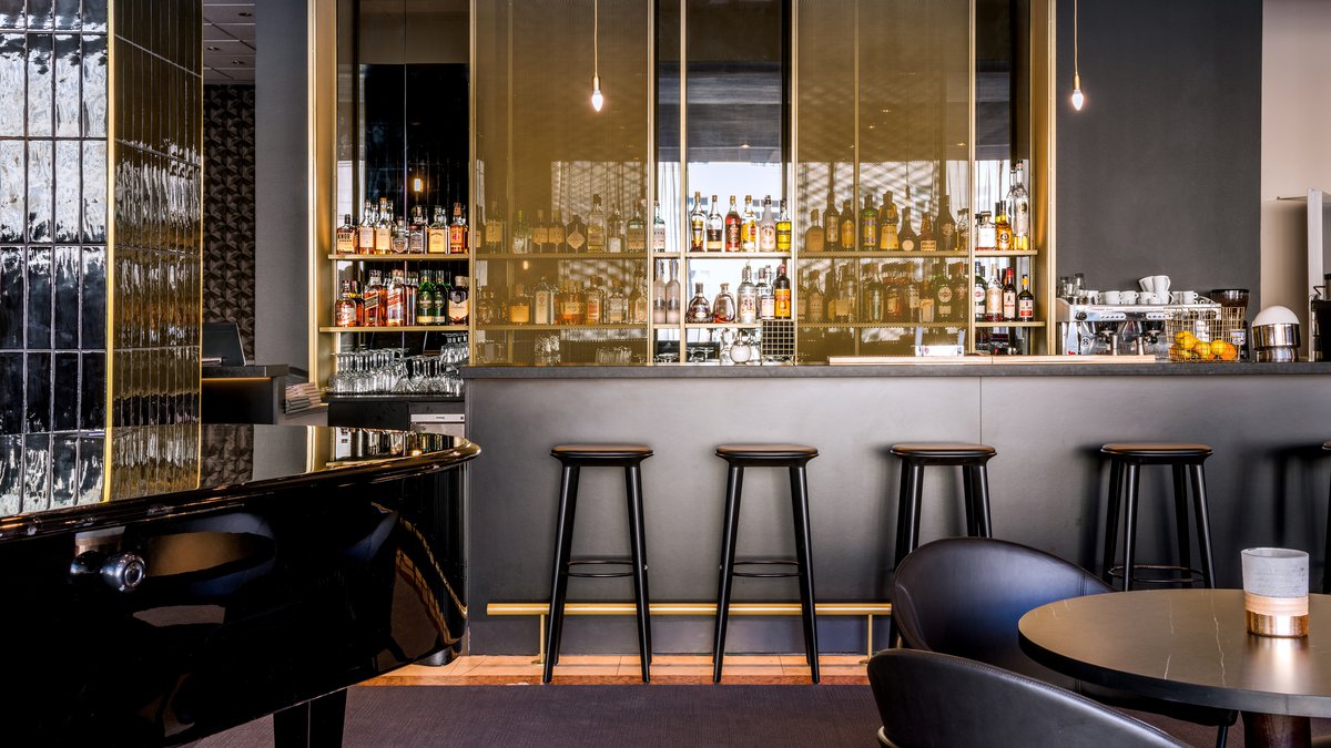 Herzstück des Erdgeschoß-Bereiches ist die lange an ihren Enden gerundete Bar, die den Gast von der Lobby bis zum Restaurant begleitet und so eine Verbindung zwischen den einzelnen Bereichen schafft. Die großen Fensterflächen des Cafés und Restaurants wurden mit langen Vorhängen atmosphärisch eingefangen.