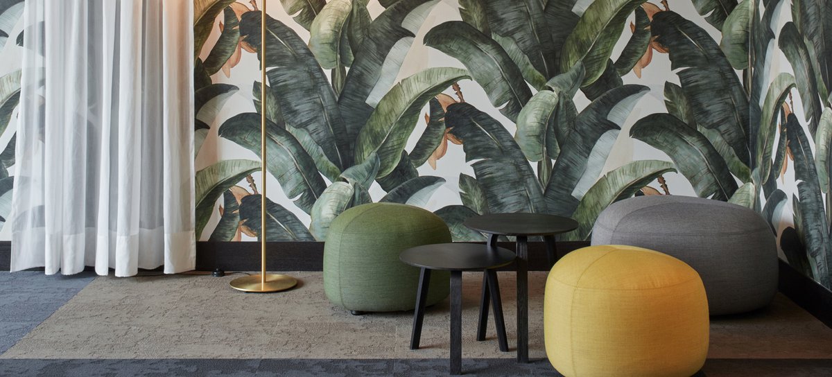 In den Vorbereichen der Konferenzräume wurden grüne Tapeten mit floralen Mustern angebracht, die das Grün der umliegenden Baumkronen optisch ins Innere ziehen. Verschiedenfarbige Teppiche, runde Spiegel, bequeme Sitzmöbel sowie Stehtische und Wandboards sorgen für entspannte Stimmung sowie Rückzugsmöglichkeiten während der Meeting-Pausen.
