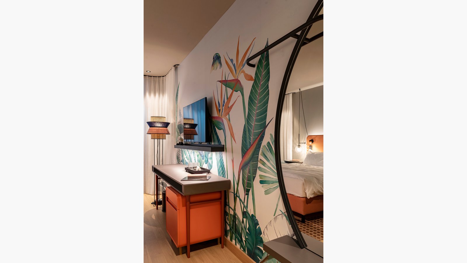 Das Konzept des Gartens setzt sich auch im gleichfalls reichlich begrünten Inneren des Boutique-Hotels fort. Ein Teil der Lobby ist ein Wintergarten, der vom Außengarten nur durch ausladende Fensterfronten getrennt ist, welche sich in der warmen Jahreszeit öffnen lassen. Unterschiedliche Bodenbeläge und Teppiche schaffen einzelne Zonen und Stimmungen. So sorgt etwa in der Bibliothek ein Parkettboden aus gebeizter Eiche für behagliches Ambiente, während ein roter Terrazzo-Boden aus Feinsteinzeug unter einer ovalen Theke den Bar-Bereich vom restlichen Raum abtrennt.