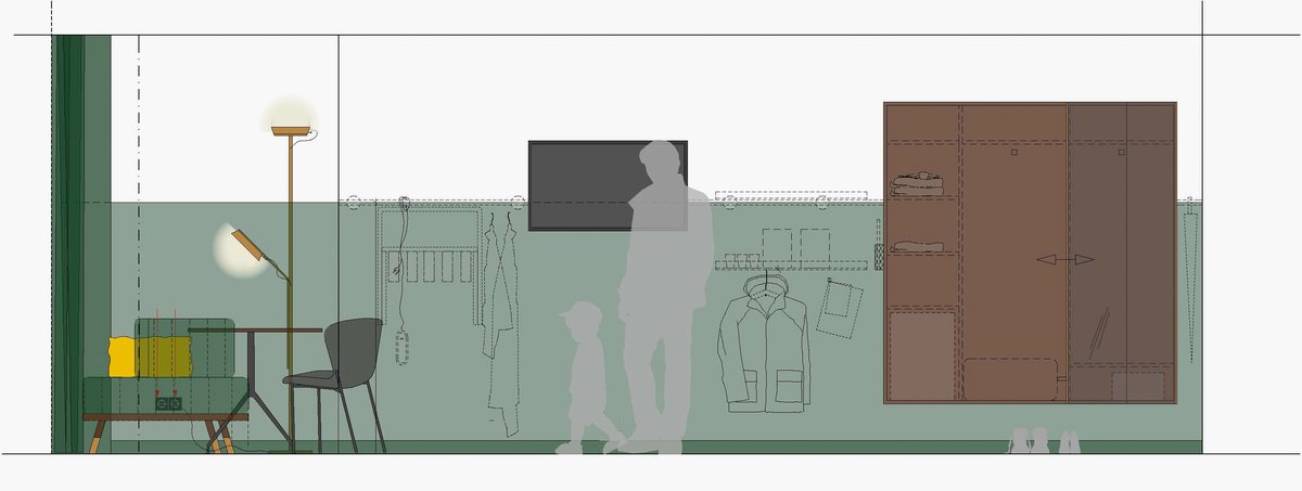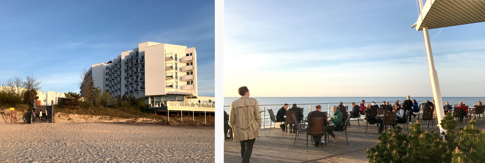 „Das Hotelgebäude ist architektonisch sehr geschickt angelegt“, führt BWM-Architekt Erich Bernard aus, „statt einer parallelen Ausrichtung zum Strand steht es quer zu diesem, was allen Zimmern Meerblick ermöglicht und zugleich den Eindruck eines sich bewegenden Schiffes gestalterisch betont.“ Jedoch zeigt sich das Wetter, genau wie auf einem Kreuzfahrtschiff, auch im Falle eines Strandhotels an der Ostsee nicht ständig von seiner besten Seite. Weswegen man in der Planung, wie Bernard betont, auch die herausforderndere Phase, nämlich die kalte Jahreszeit, miteinbezogen hat. „Auch auf einem Passagierdampfer spielt sich das Leben wetterbedingt in erster Linie in zwei Hauptbereichen ab: an Deck und unter Deck“, so der Architekt.