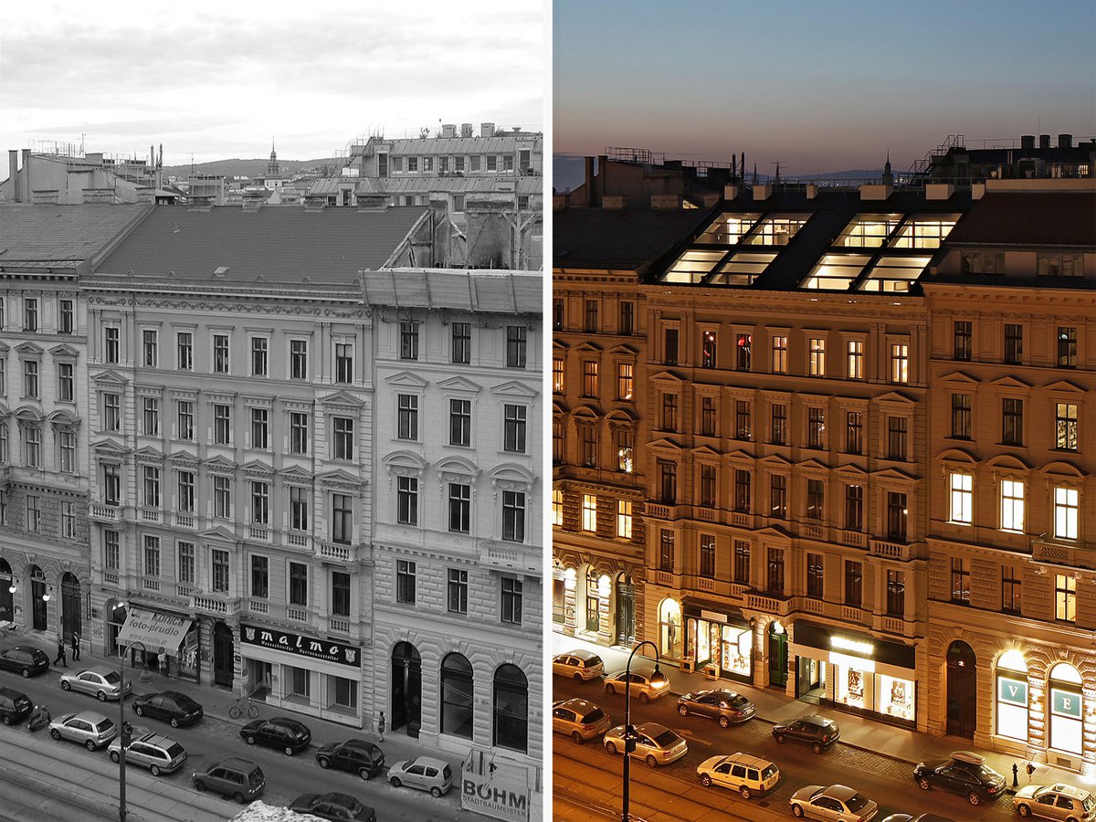 A loft in a centrally located residential building was converted to create three premium freehold and rental flats with outside spaces. The building is part of a historical ensemble between the famous Ringstrasse and the Natural History Museum. The flats all have a conservatory that affords a spectacular view of Vienna’s historical centre. The large hinged windows, which can be tilted outwards to open fully, add extra space to the interior and create a connection to the outside without interfering too much with the roof landscape of the heritage-protected building.