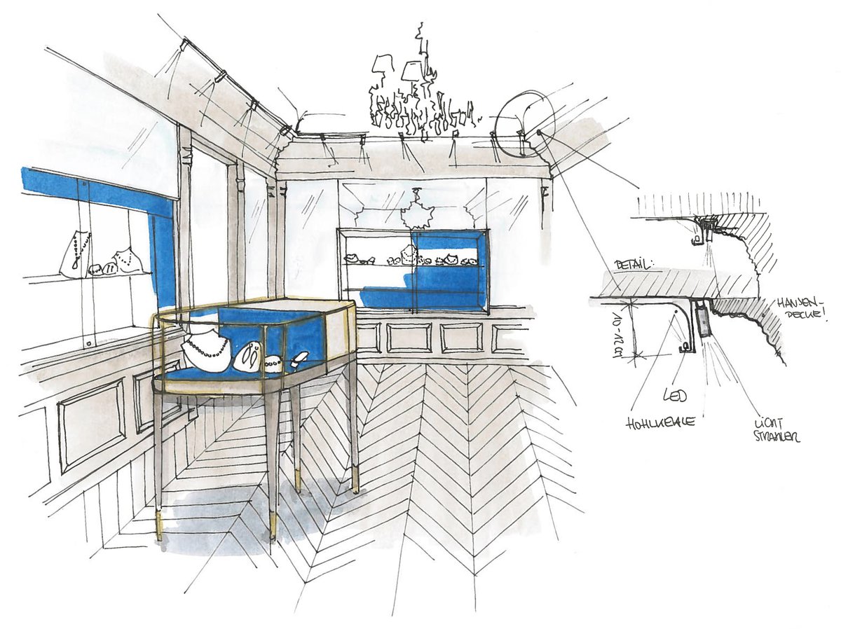 The upper floor houses the historical workshop in which the exclusive jewellery is crafted to this day. Just outside the workshop is a room with the intimate atmosphere and flair of a 19th century salon, where the Köchert experts gladly give customers competent advice. Valuable original sketches of jewellery designs adorn the walls in salon style. At the same time, the salon serves as a museum that documents the long tradition of the former imperial jeweller. From here, visitors can also catch glimpses of the workshop and the machines, some of which date back to the very beginnings of the company. Erich Bernhard: “In this sensitive project, hardly anything was left untouched. But it was important to us to keep this from being too apparent and also to preserve as many traces of history as possible.”