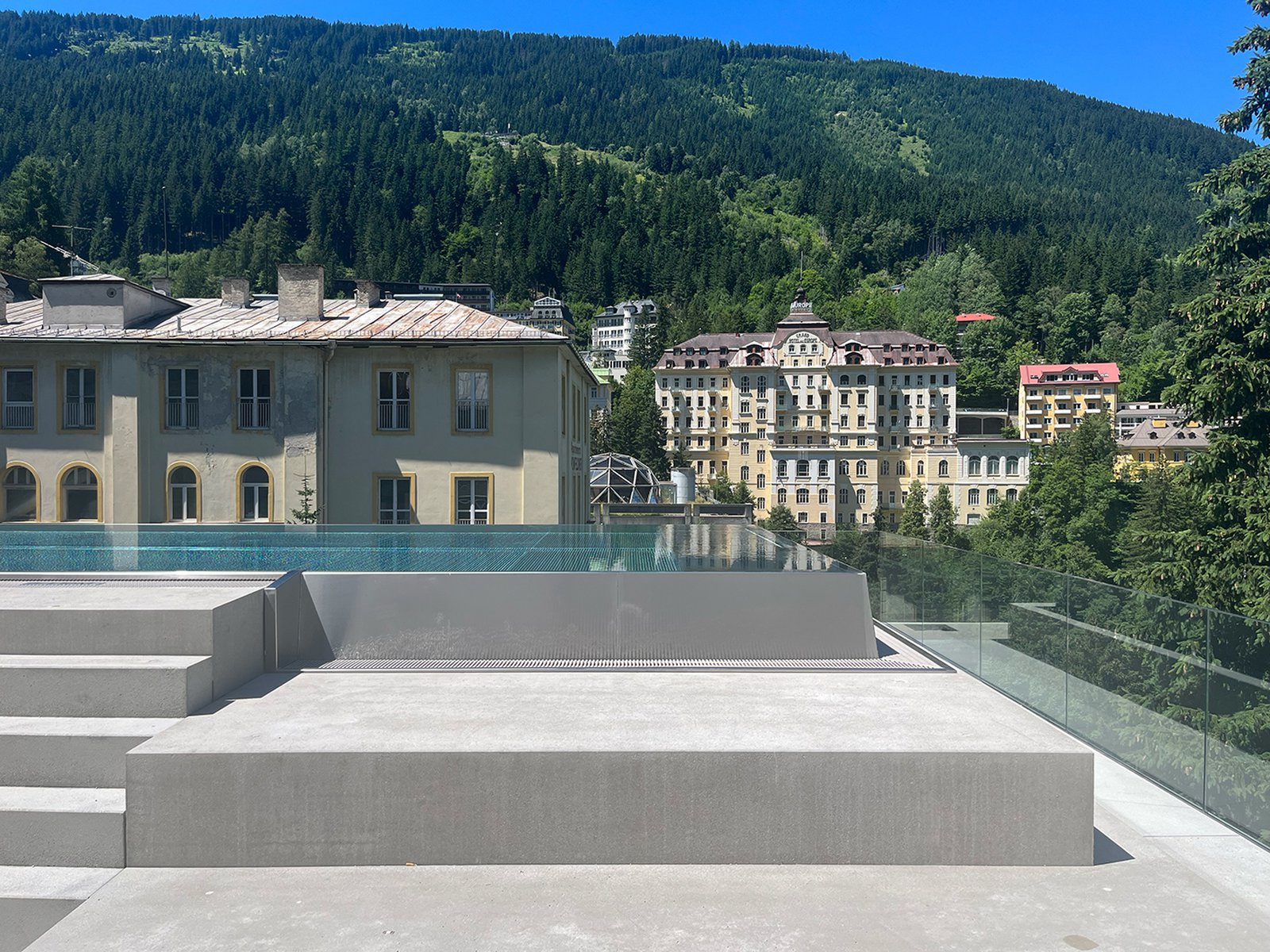 To the left of the entrance, on the west side of the building, is the spa area, which spans the top three floors. Coming from the lobby on the ground floor, guests first enter a courtyard with a chessboard floor (including chess figures), based on the chessboard tile floors in the original treatment rooms. This is a recurring pattern that is also found – albeit in different colours – in the restrooms, corridors and spa reception. On the mezzanine floor are the five new treatment rooms as well as four spa suites, which are spacious rooms featuring free-standing bathtubs, showers installed in converted original basins, and integrated pine saunas. There is a new pool landscape above the original thermal bath tract, where guests can gaze across Gastein Valley and “swim out into nature” to the sound of the nearby waterfall.
