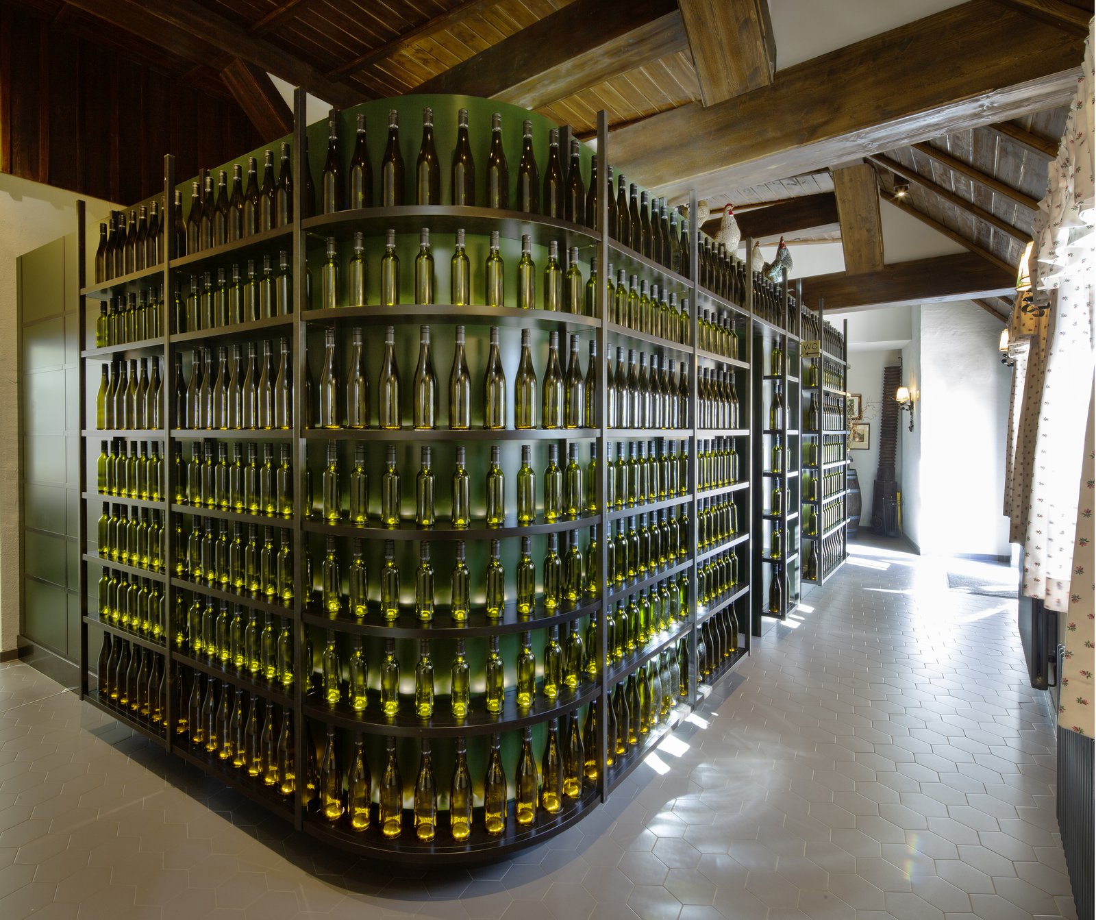 Finally, the former wine press house, which houses a wooden wine press dating back to the 1600s, was converted into a shop and tasting room. The floor is made partly of wood and partly of limestone. A lamp made from green wine bottles is suspended above the high, elongated tasting table, which also contains built-in storage space for wine crates. As architect Erich Bernard says, the simplicity of the basic texture generally creates the kind of atmosphere that distinguishes a traditional Heuriger from a regular restaurant. “The materials that are so typical for a Heuriger create a sense of cosiness,” he says. “These include a variety of different-coloured wood, warm colours and classic surfaces like stainless steel.” Simple profiles and monochromatic, unadorned, restrained elements predominate. Only the décor and textiles such as the lampshades and curtains feature colourful accents and traditional ornamental elements.