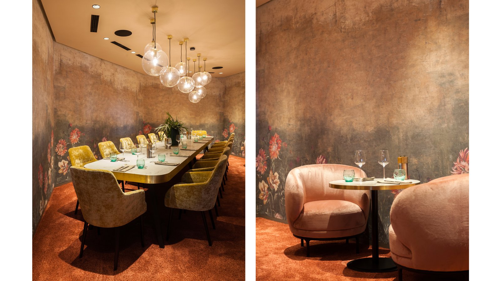 Guests looking for a little more privacy can use the partitioned dining room situated opposite the bar. Surrounded by floral wallpaper and portraits of famous hotel guests, the table in this private dining area can seat up to 14 people. In addition, guests can make use of the two private booths for a more intimate setting: the first booth, with a feminine flair, is a tribute to the modern female globetrotter; the dark-green second both, ideal for night owls, calls to mind long theatre nights. The latter can also be converted into a stage as needed.