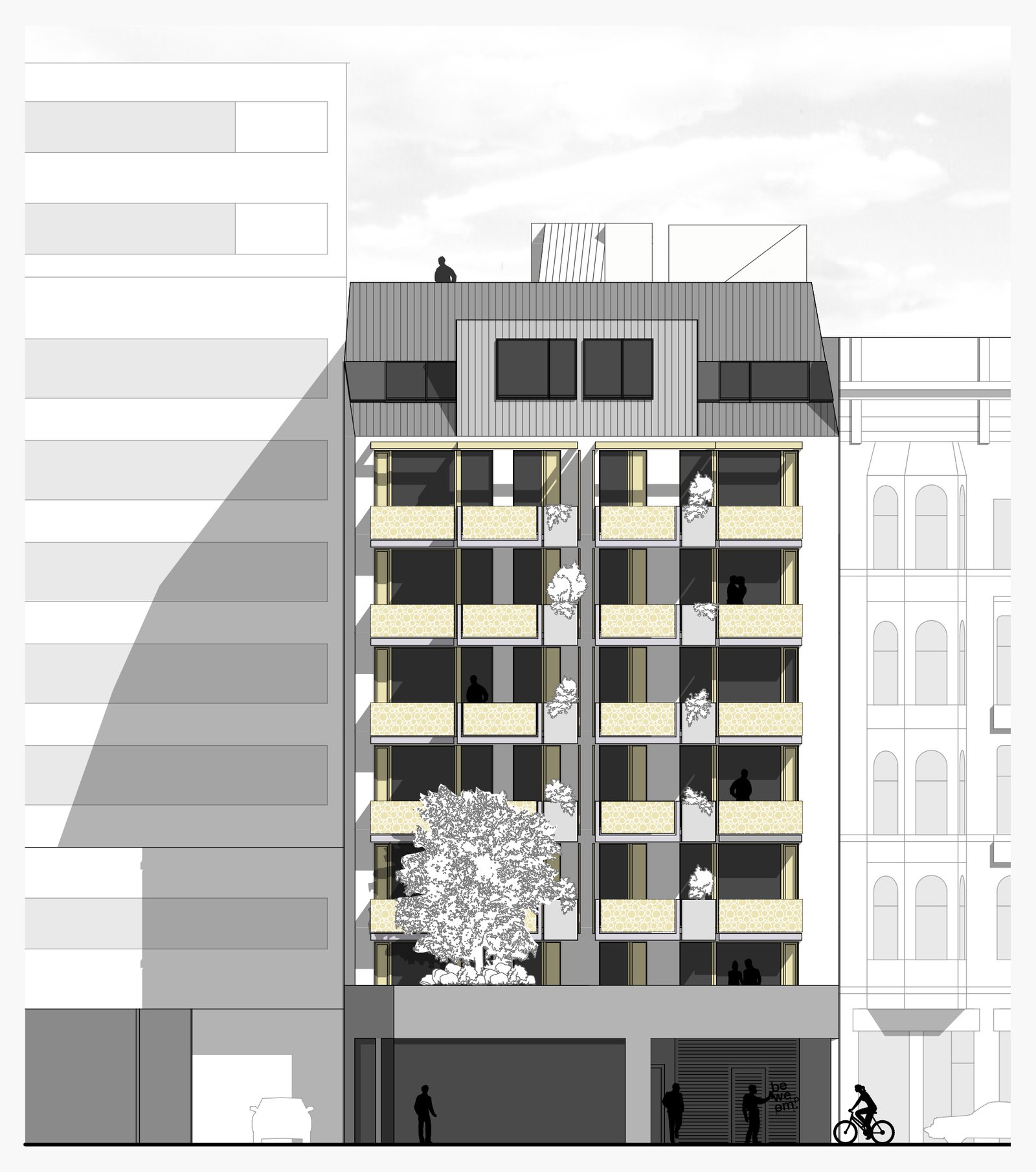 Construction of a residential building with 29 freehold flats and office space on a narrow site in Schönbrunner Strasse in Vienna