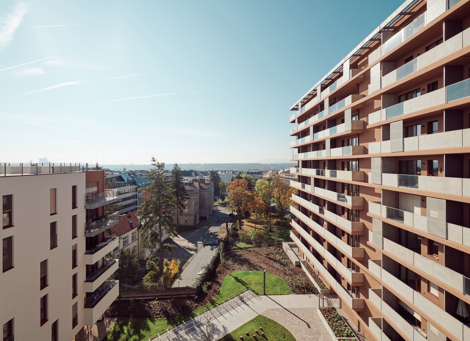 Building no. 7 is staggered and divided into many small units, with recesses for open spaces. It is visually connected to the existing architectural surroundings, with a smooth transition from these older buildings to the larger scale of the new structure. The building’s facade was designed to maximise open spaces – the wraparound balcony zones (actually a fire safety measure) made it possible to create an above-average amount of open space that can be accessed directly from each room. Because the nearest neighbouring structure is more than 100m away, residents have an unobstructed view across the park. A lot of the units are corner flats, which benefit from natural light coming from two directions. Concrete was used as a design element in a highly visible way, for instance for the balusters. The privacy shield elements are all made of galvanised steel and are something of a “second skin”.