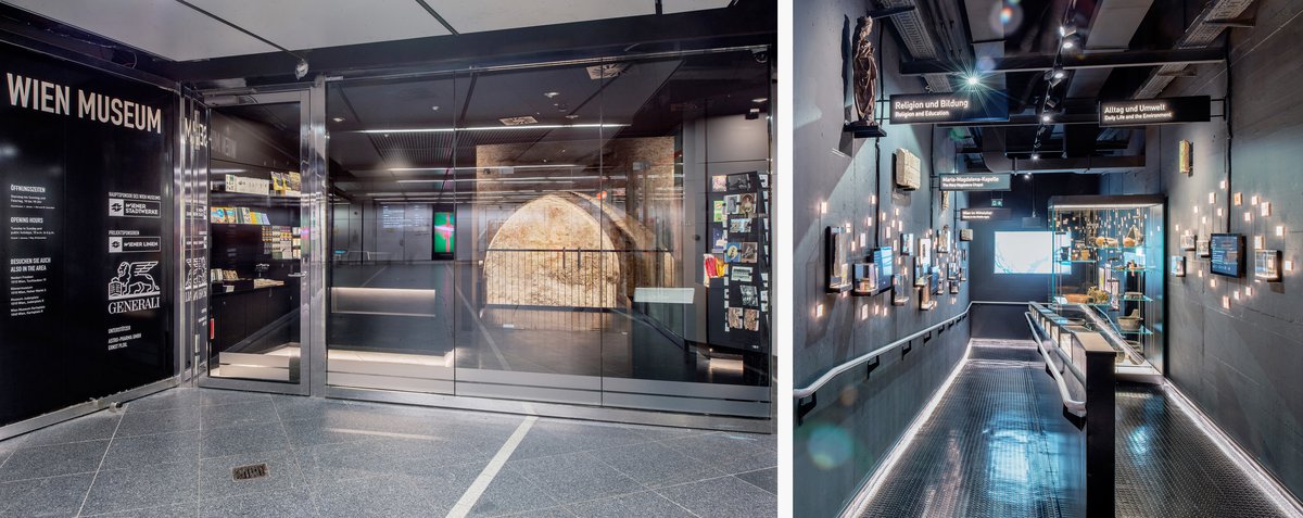 A compact permanent exhibition about the history of the chapel and medieval Vienna follows in the adjoining room. Visitors can access information and music from the time of its creation with the help of a media guide system. The new entrance from the underground passage houses the shop and the ticket office. These additions are also uniformly black so that they do not distract from the view into the chapel.